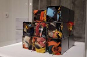 En résidence à TAMAT, en 2015, Caroline Fainke y mène une réflexion sur le lien inhérent entre l’endroit et l’envers des tissus, entre la face visible et la face cachée, noble et obscure des textiles. Elle soulève ici une question sensible, sur le plan sociologique, liée à toutes les “petites mains” anonymes œuvrant dans l’ombre à la production de biens de consommation mais garantes de la pérennité de la société et de son développement. Se révèlent les coulisses d’un travail laborieux, souvent occulté, répondant à la loi de la productivité et que reflète symboliquement l’accumulation de mini-containers emplis de déchets textiles.